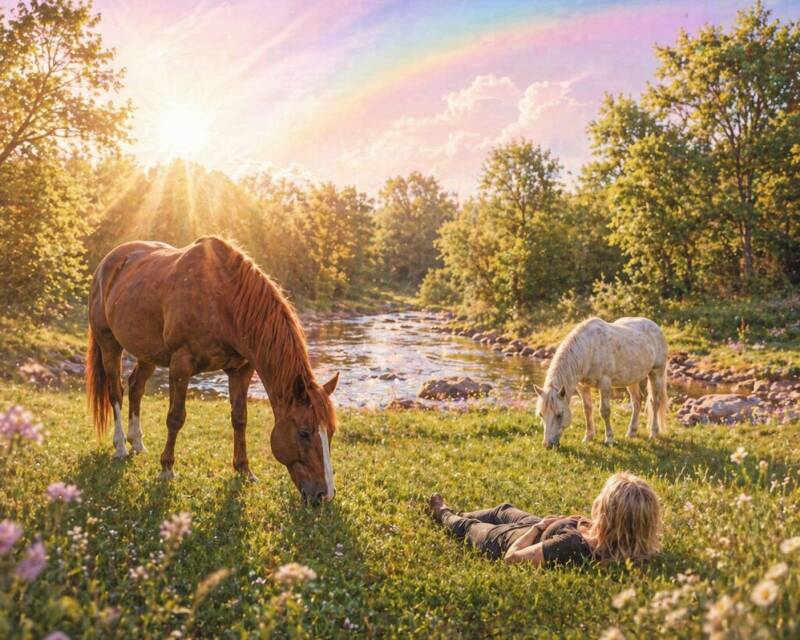 Het zachte geluid van grazende paarden om me heen.